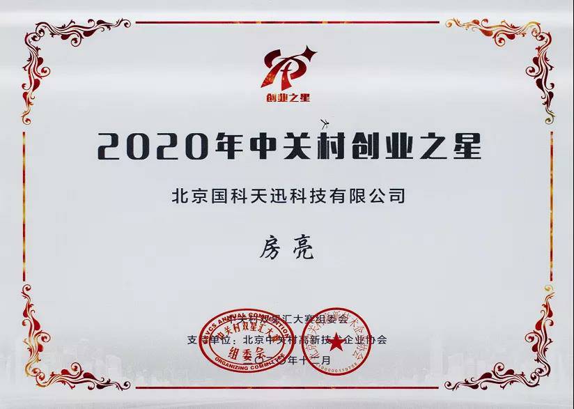12月21日,在北京市科委、中关村管委会、中关村科学城管委会的指导与支持下,由北京中关村高新技术企业协会主办的2020中关村“双星汇—创业之星”榜单隆重发布。经严格的数据核实及分析、评委会审议、大数据舆情调查等程序,国科天博-天博(中国)创始人房亮从众多杰出创业者中脱颖而出,荣获“2020年中关村创业之星”荣誉称号。